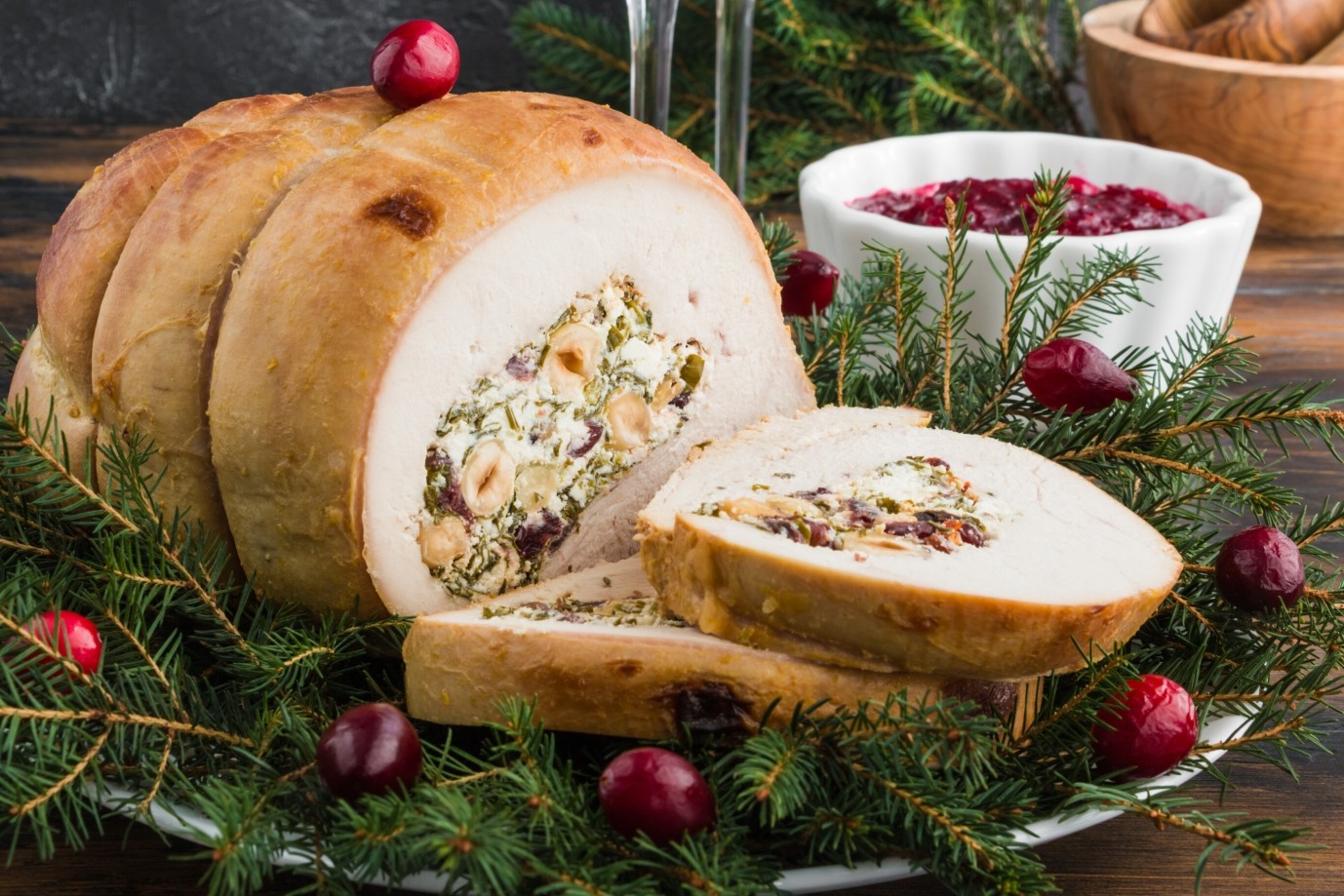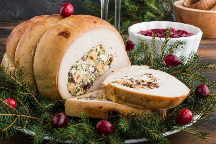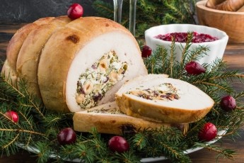 Boneless Turkey Breast with Sage and Onion Stuffing De-boned Turkey Breast, lattice wrapped in our own smoked streaky bacon, stuffed with our Famous Sage & Onion Stuffing and sealed in its own roasting bag, allowing you more time to celebrate and less time in the kitchen A delicious roast ready in around one hour.